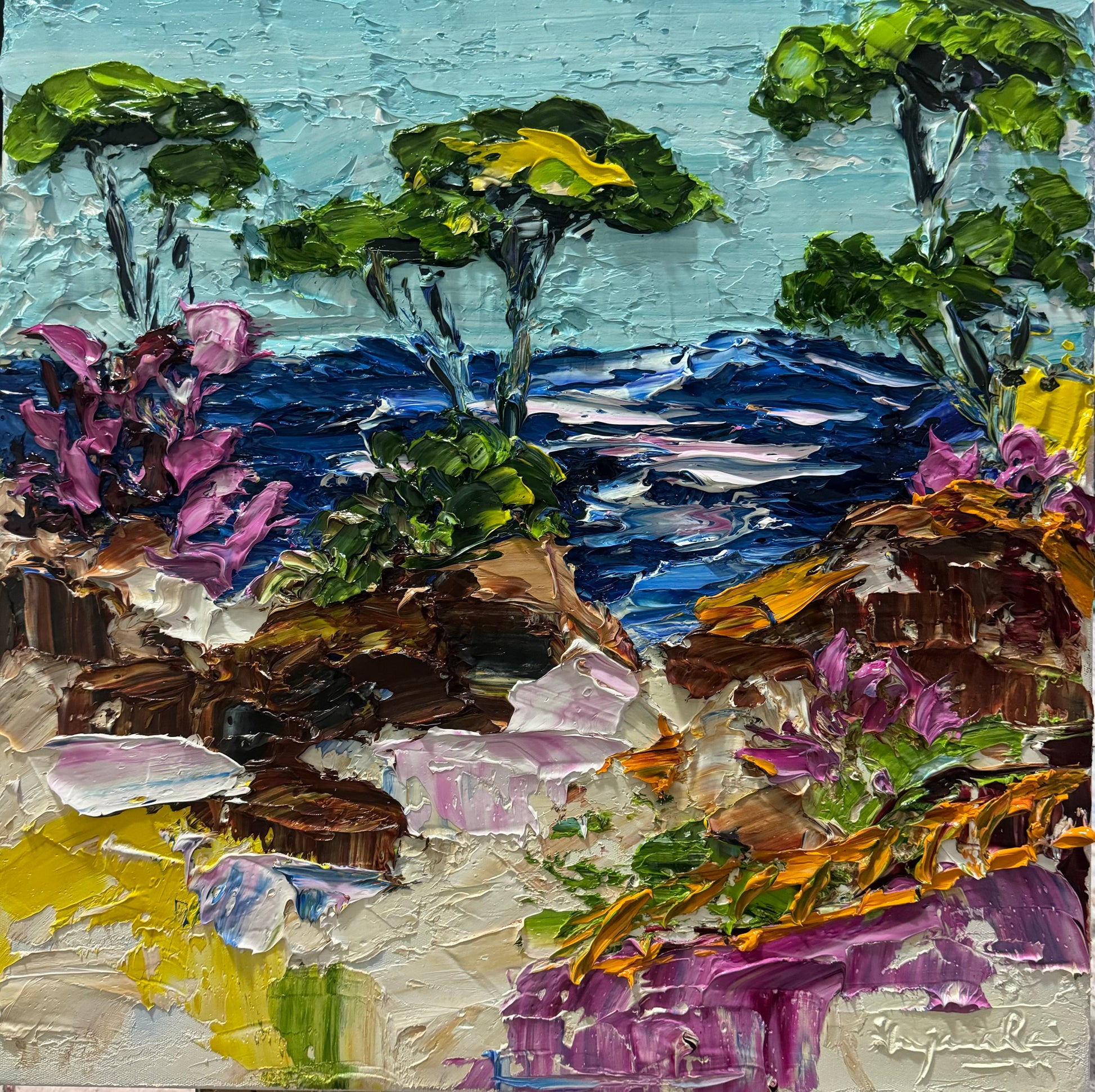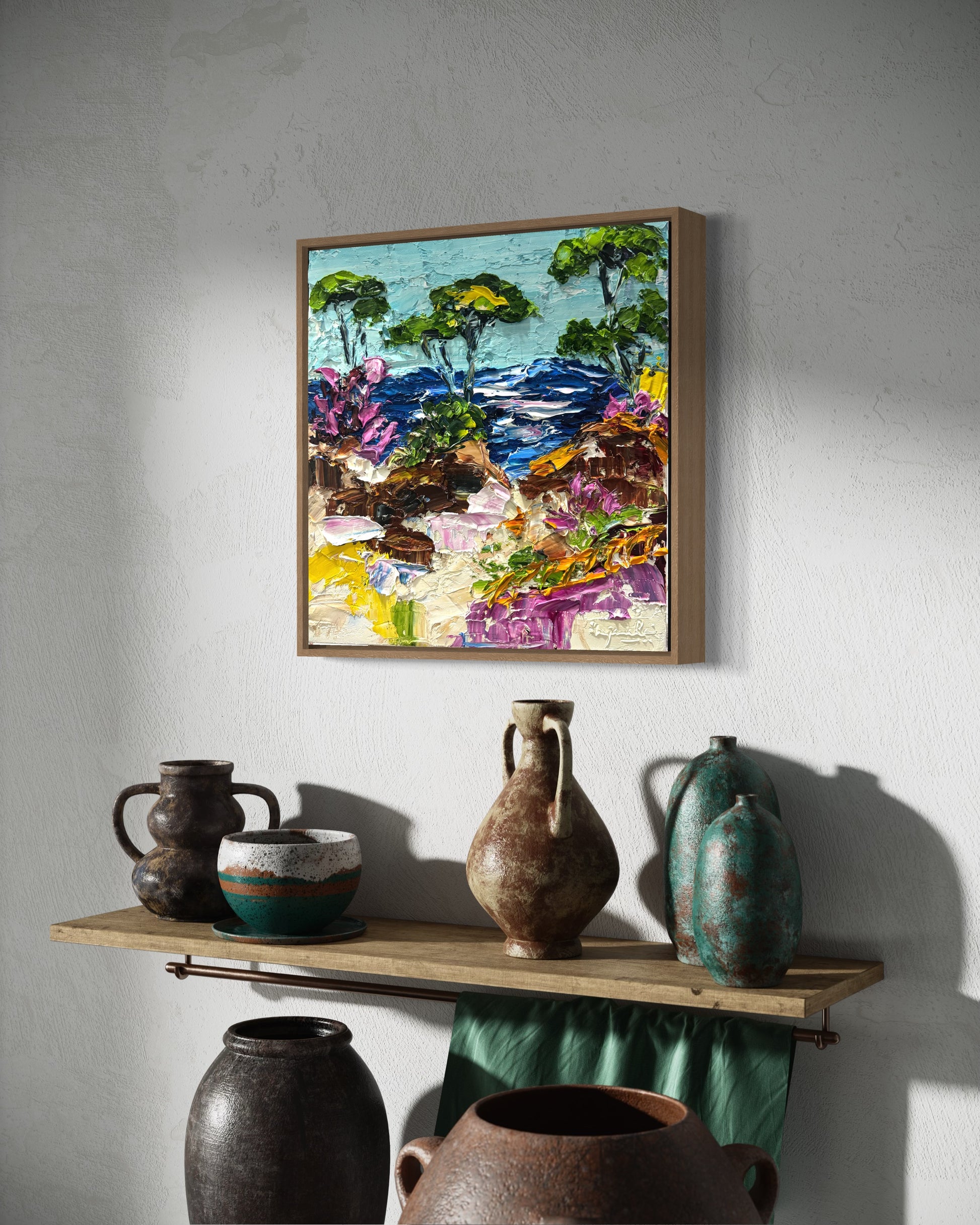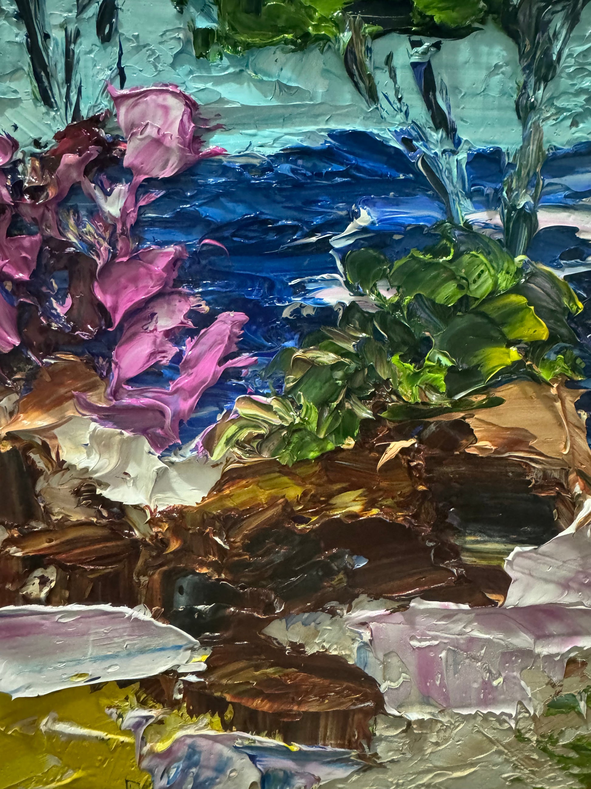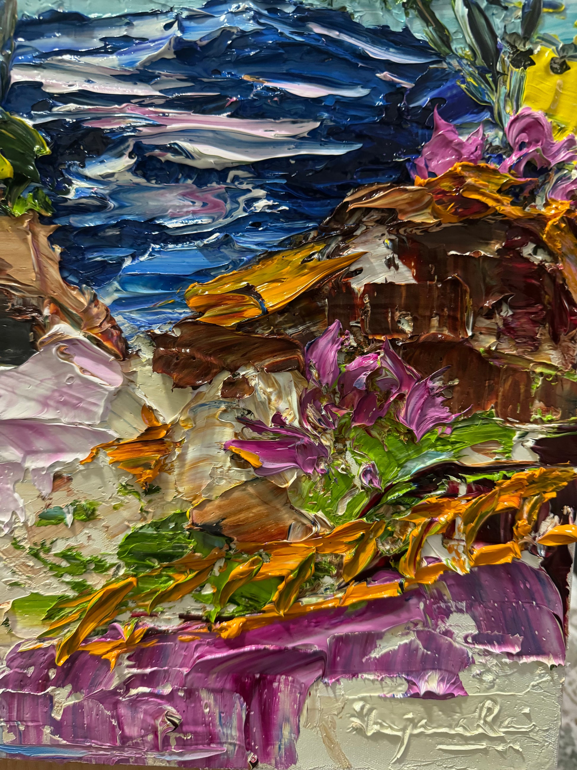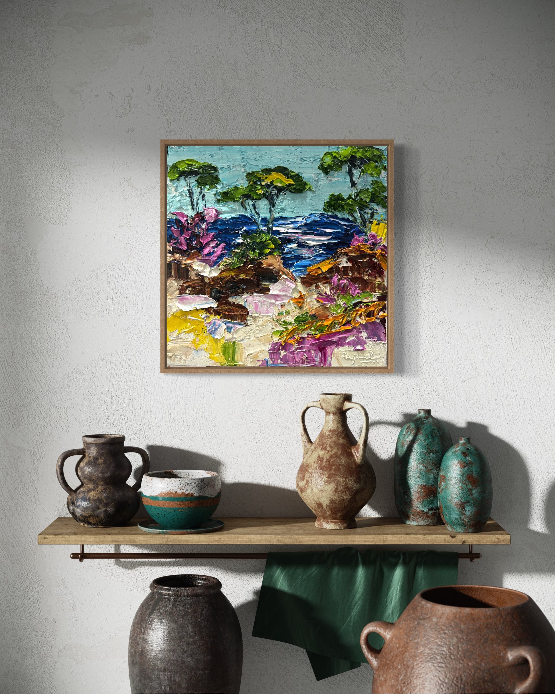 This abstract landscape is made using thick layers of oil paint, with palette knife. The technique is called impasto painting.
