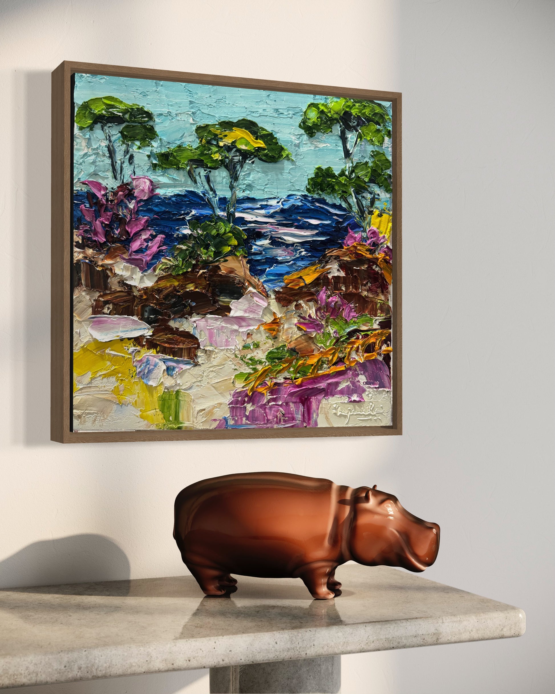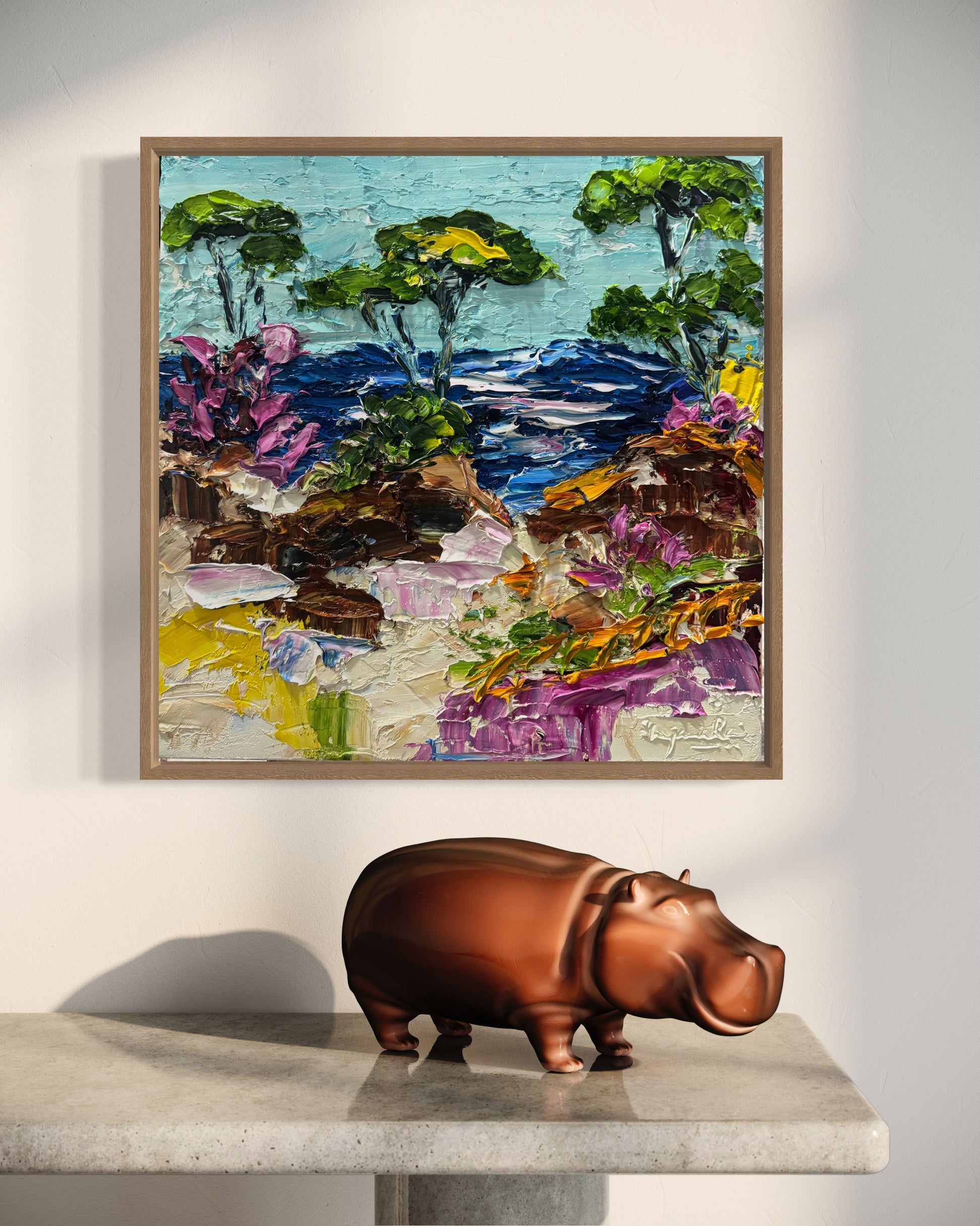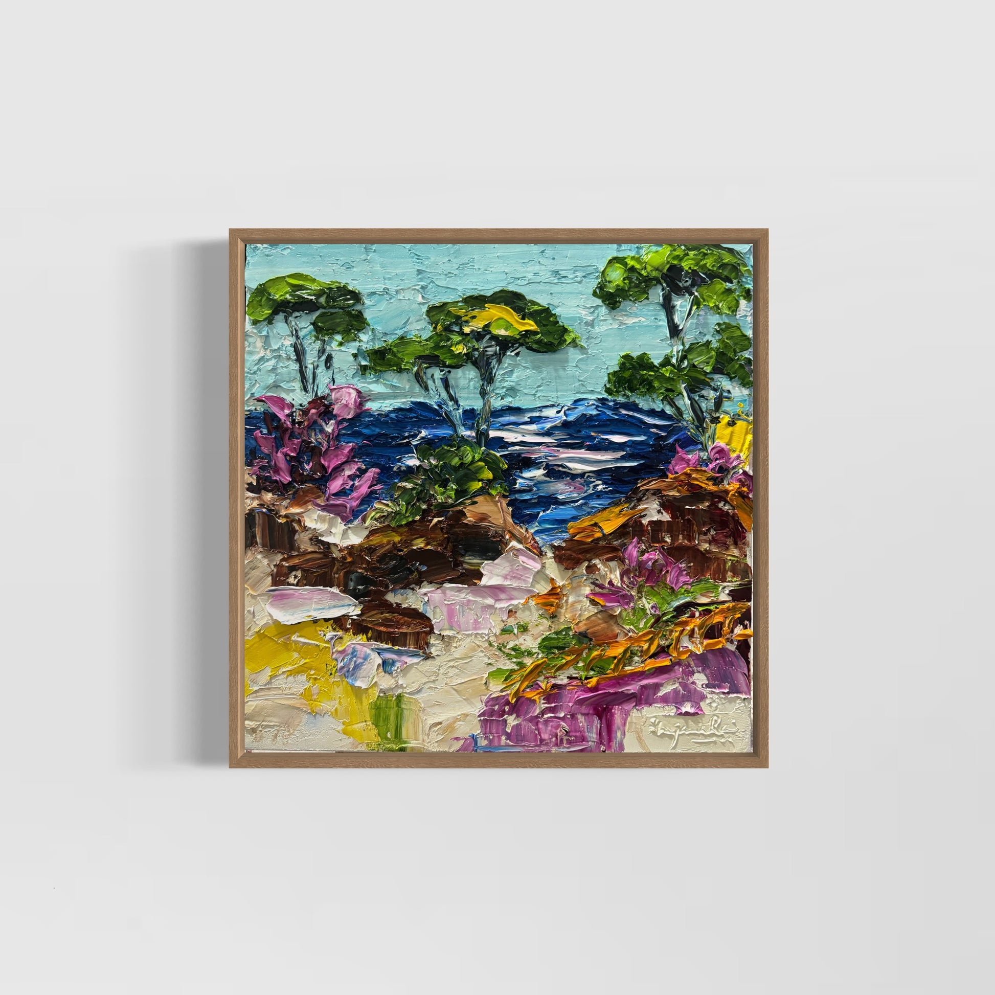 The artwork is varnished for protection and is framed in oak wood floater frame.